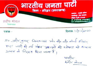 हरिद्वार। भारतीय जनता पार्टी ओबीसी मोर्चा हरिद्वार के जिलाध्यक्ष डा. प्रदीप कुमार द्वारा जारी की गई मंडल अध्यक्षों की घोषणा को जिलाध्यक्ष संदीप गोयल ने तत्काल प्रभार से निरस्त कर दिया है।बताया जा रहा है […]