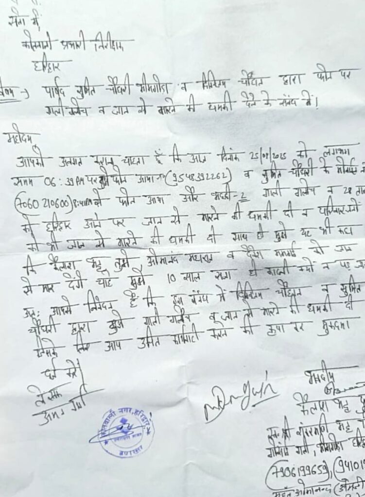 हरिद्वार। नगर निगम, हरिद्वार के वार्ड नं – 6, भीमगोड़ा के वर्तमान भाजपा पार्षद सुमित चौधरी ने कांग्रेस के पूर्व पार्षद कैलाश भट्ट को फोन पर मां बहन की गंदी-गंदी गालियां देते हुए 28 तारीख के बाद जान से मारने की धमकी दी है।
