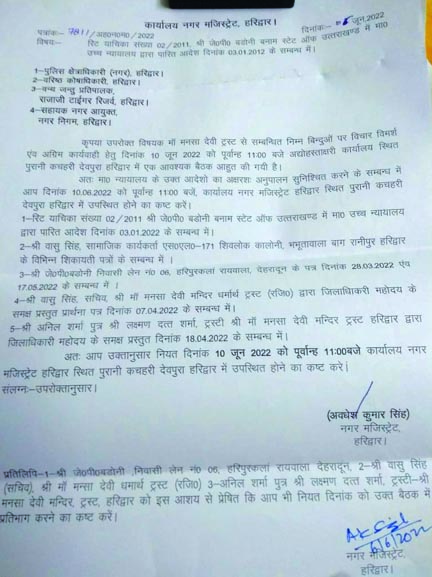 हरिद्वार। मां मंशा देवी ट्रस्ट विवाद को लेकर सिटी मजिस्ट्रेट कार्यालय में चल रहे प्रकरण में सिटी मजिस्ट्रेट ने आगामी 10 जून को विवाद से जुड़े दोनों पक्षों को प्रस्तुत होने के निर्देश दिए गए हैं। इसके साथ ही पुलिस क्षेत्राधिकारी, कोषाधिकारी, वन्य जंतु प्रतिपालक राजाजी पार्क व सहायक नगर आयुक्त को भी पत्र भेजा गया है।