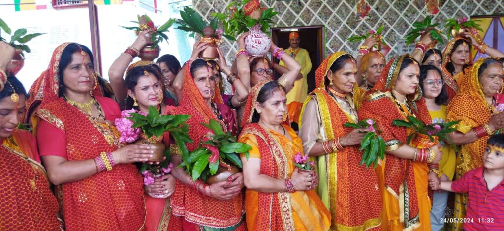 बित्थड़ (रानीखेत)। सात दिवसीय श्रीमद्भागवत ज्ञानयज्ञ के लिए श्रीराधाबल्लभ परिवार द्वारा आयोजित भव्य मंगल कलश यात्रा निकाली गयी। कलश यात्रा में परिवार समेत पूरे गांव से महिलाएं शामिल हुई। कलश यात्रा गृह प्रांगण से शुरू होते हुए गांव की पगडंडियों से होते हुए सिद्धिदात्री मंदिर, धूणी में पहुंची। मंदिर में पूजा अर्चना के बाद उसी मार्ग से होते हुए गृह प्रांगण के कथा पंडाल स्थल पर पहुंची।