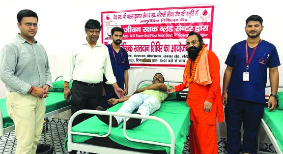 कनखल स्थित देशरक्षक औषधालय के आयुर्वेदिक चिकित्सा केंद्र में रक्तदान शिविर का आयोजन किया गया। वैघ.स्व. पारस कुमार जैन एवं स्व. मीना जैन की स्मृति में जीवन रक्षक ब्लड सेंटर के सहयोग से आयोजित रक्तदान शिविर का शुभारंभ अखाड़ा परिषद अध्यक्ष एवं श्री पंचायती अखाड़ा महानिर्वाणी के सचिव श्रीमहंत रविंद्रपुरी महाराज ने दीप प्रज्वलित कर किया।
