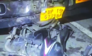 दो कारों की आमने-सामने की भिडंत, पुलिया तोड़कर नाले में गिरीं कार