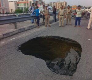 पतंजलि फ्लाईओवर पर अचानक सड़क धंसी, बना गहरा गड्ढा