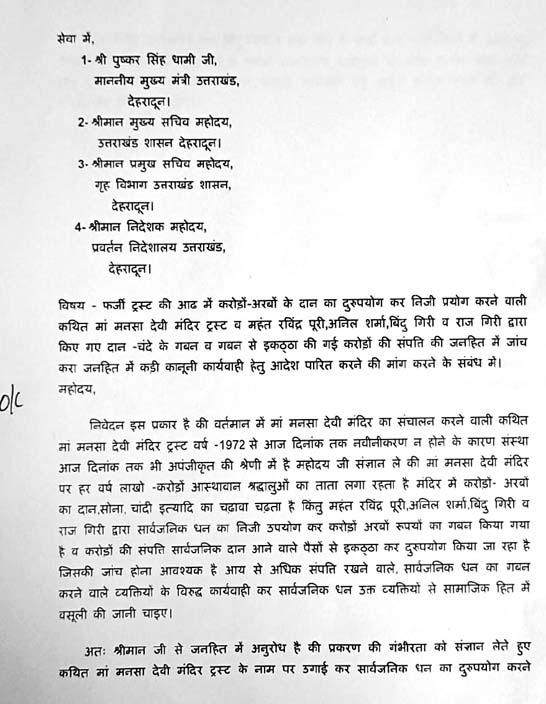 हरिद्वार। सामाजिक कार्यकर्ता वासू सिंह निवासी एसएल 17, शिवलोक कालोनी भभूतावाला बाग हरिद्वार ने प्रदेश के मुख्यमंत्री पुष्कर सिंह धामी, मुख्य सचिव, प्रमुख सचिव व प्रवर्तन निदेशानल देहरादून को पत्र प्रेषित कर मंशा देवी मंदिर मंे आने वाले करोड़ों रुपये के दान का दुरूपयोग करने और निजि कार्य में लाकर करोड़ों की सम्पत्ति अर्जित करने का आरोप लगाते हुए आरोपियों की सम्पत्ति की जांच की मांग की है।