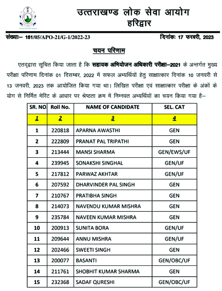 आयोग के सचिव गिरधारी सिंह रावत द्वारा जारी आदेश के अनुसार 61 चयनित अभ्यर्थियों के नाम और रोल नंबर आयोग की वेबसाइट पर अपलोड कर दिए गए हैं। एपीओ की मुख्य लिखित परीक्षा व इंटरव्यू के अंकों के आधार पर अभ्यर्थियों की मेरिट लिस्ट घोषित की है।