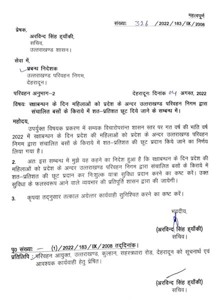 रक्षाबंधन पर उत्तराखंड सरकार ने बहनों को तोहफा दिया है। महिलाएं रक्षाबंधन के दिन उत्तराखंड परिवहन निगम यानी उत्तराखंड रोडवेज की बसों में निःशुल्क यात्रा कर सकेंगी। उत्तराखंड शासन ने इसको लेकर उत्तराखंड परिवहन निगम को आदेश जारी किया।