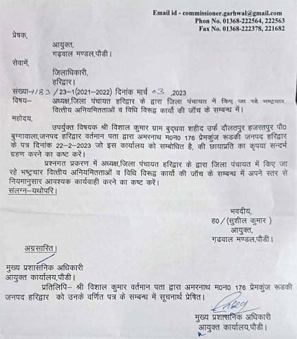 मिली जानकारी के अनुसार विशाल कुमार निवासी अमरनाथ मकान नंबर 176 प्रेमकुंज रुड़की ने एक शिकायती पत्र आयुक्त गढ़वाल मंडल पौडी को भेजा था, जिसमें उन्होंने जिला पंचायत अध्यक्ष हरिद्वार पर भ्रष्टाचार करने का आरोप लगाया था। इसी शिकायत पत्र के आधार पर पौड़ी गढ़वाल मंडल आयुक्त ने मामले में संज्ञान लेते हुए डीएम हरिद्वार को जिला पंचायत में हुए भ्रष्टाचार की जांच करने के आदेश दिए हैं। उन्होंने मामले में डीएम से जांच कर अपने स्तर से कार्रवाई करने के आदेश दिए।