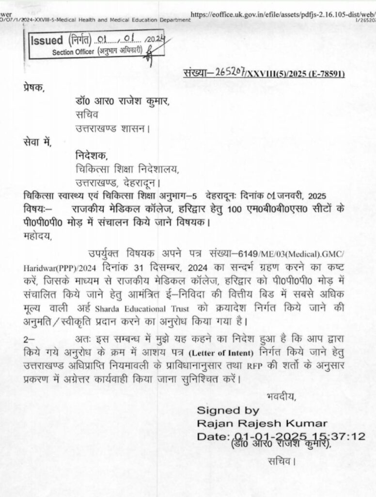 उत्तराखंड शासन के सचिव डा० आर० राजेश कुमार ने निदे‌शक चिकित्सा निदेशालय उत्तराखंड देहरादून को पत्र लिखकर राजकीय मेडीकल हरिद्वार को पी०पी०पी०मोड मे संचालित करने हेतु ई निविदा के द्वारा शारदा एजुकेशनल ट्रस्ट को सौंपने की अनुमति दे दी हैं।