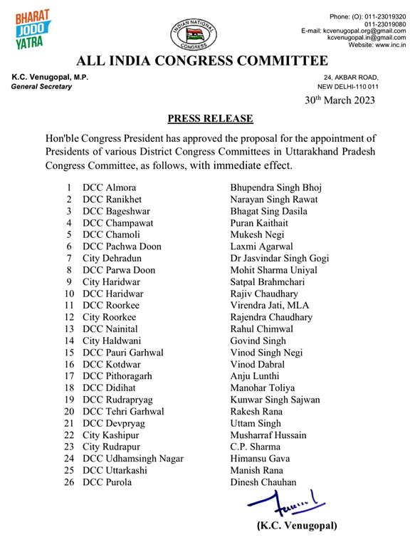 उत्तराखंड के 26 सांगठनिक जिलों की कांग्रेस के राष्ट्रीय महासचिव संगठन वेणुगोपाल ने सूची जारी कर दी है।