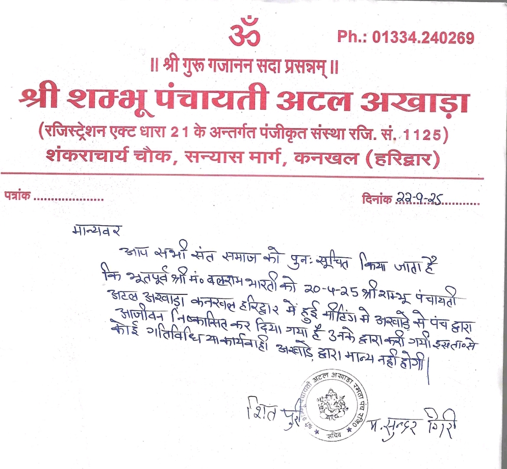 संत समाज ने मांग की है कि इस मामले में संबंधित अखाड़े और अखिल भारतीय अखाड़ा परिषद उचित संज्ञान लेकर आवश्यक कार्रवाई करें, ताकि भविष्य में इस तरह की घटनाओं की पुनरावृत्ति न हो और अखाड़ों की परंपरा एवं मर्यादा बनी रहे।
