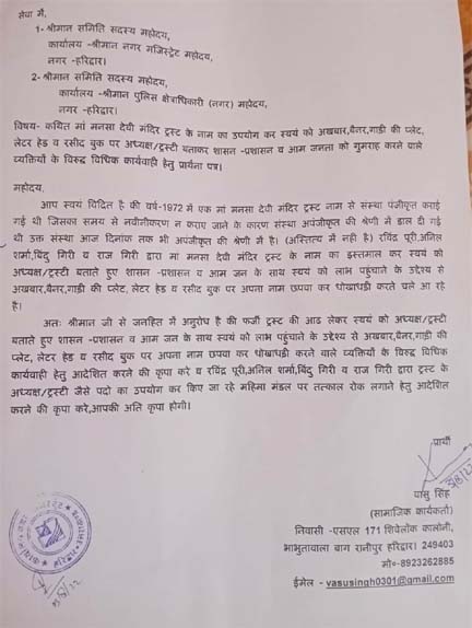 वहीं दूसरी ओर शिवलोक कालोनी भभूतावाला बाग निवासी वासू सिंह ने नगर मजिस्ट्रेट का पत्र देकर कथित मां मंशा देवी मंदि ट्रस्ट के नाम का उपयोग कर अखबारों, लेटर पैड व रसीद कबुक आदि पर अध्यक्ष/ ट्रस्टी बताकर शासन-प्रशासन व आमजन का गुमराह करने वालों के खिलाफ कार्यवाही किए जाने की मांग की है।