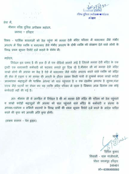 हरिद्वार। मां मंशा देवी मंदिर परिसर में हो रहे अनैतिक कृत्यों के खिलाफ श्यामपुर ग्राम गाजीवाली निवासी विपिन कुमार ने एसएसपी को पत्र देकर कार्यवाही की मांग की है।