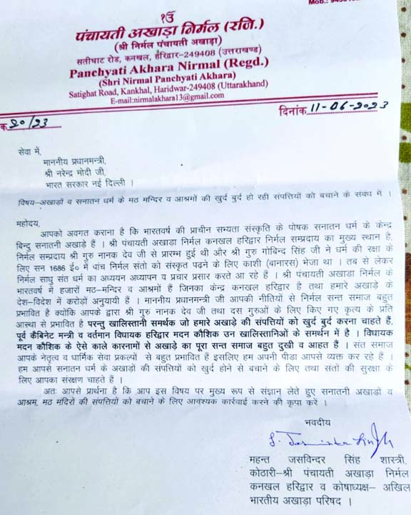 हरिद्वार। श्री पंचायती अखाड़ा निर्मल के कोठारी व अखिल भारतीय अखाड़ा परिषद के कोषाध्यक्ष महंत जसविन्दर सिंह शास्त्री ने नगर विधायक मदन कौशिक पर बेहद गंभीर आरोप लगाते हुए प्रधानमंत्री नरेन्द्र मोदी को पत्र लिखकर कार्यवाही की मांग की है।
