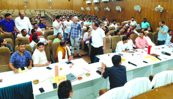 नगर आयुक्त ने कहा कि सभी पार्षद एजेंडे पर वार्ता करें, तो पार्षद बोले कि उन्हें उनके सवालों का जवाब दिया जाए, तो नगर आयुक्त ने एक दोहे के सहारे पार्षदों के सवालों का जवाब दिया। जिस पर पार्षदों ने आरोप लगाया कि नगर आयुक्त द्वारा उन्हें चोर कहा गया है। इस बात पर नगर आयुक्त और विवेक चौधरी के बीच बहस भी हुई। वहीं सामान खरीद आदि के टेंडरों के बिल पास होने, कर्मचारियों का पीएफ आदि न देने पर पार्षद विवेक चौधरी और नितिन त्यागी ने कोषागार अधिकारी को जमकर घेरा, तो वहंी यूजर चार्ज के मामले में पार्षद चारुचंद्र ने भी आवाज उठाई। अपनी नाराजगी को लेकर पार्षदों ने देर तक हंगामा काटा। कुल मिलाकर बैठक में पार्षद वार्ड की समस्याओं को लेकर जिस तरह से महापौर व नगर आयुक्त पर हमलावर रहे।