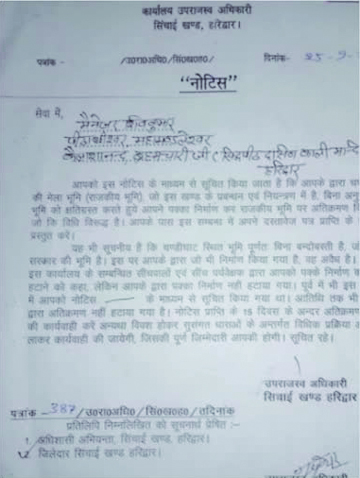 उप राजस्व अधिकारी सिंचाई विभाग में नोटिस में लिखा है कि चंडी घाट स्थित भूमि जो कि राज्य सरकार की है, उस पर कैलाशानंद गिरि ने जो भी निर्माण किया है वह अवैध है। इस मामले पर सिंचाई विभाग द्वारा पहले भी नोटिस भेजा जा चुका है, जिसका नोटिस में भी जिक्र है। नोटिस में लिखा है कि इससे पहले भी इस भूमि पर आपके द्वारा किए गए पक्के निर्माण को हटाने को कहा गया था, लेकिन आपके द्वारा पक्का निर्माण नहीं हटाया गया। जिसमें आपको नोटिस से पहले भी सूचित किया गया था। तब भी आपके द्वारा अतिक्रमण नहीं हटाया गया है। नोटिस मिलने के 15 दिन के भीतर अतिक्रमण हटाने की कार्रवाई करें, अन्यथा विवश होकर कानूनी कार्रवाई की जाएगी।