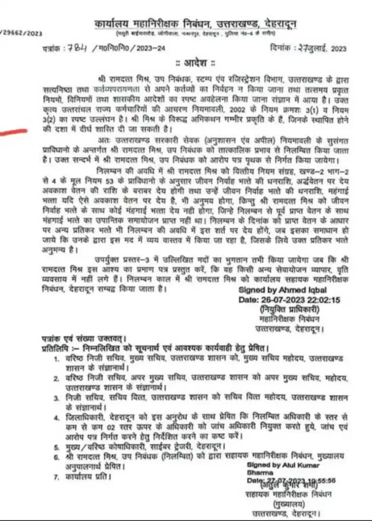 देहरादून। उत्तराखंड शासन की ओर से आज एक बड़ी खबर सामने आ रही है। जिसमें विगत दिनों रजिस्ट्रार कार्यालय देहरादून में हुई गड़बड़ी मामले में सख्ती दिखाते हुए उपनिबंधक स्टांप एवं रजिस्ट्रेशन राम दत्त मिश्र को निलंबित कर दिया गया है। महानिरीक्षक निबंधन कार्यालय उत्तराखंड देहरादून द्वारा उक्त निलंबन के आदेश जारी कर दिए गए हैं।