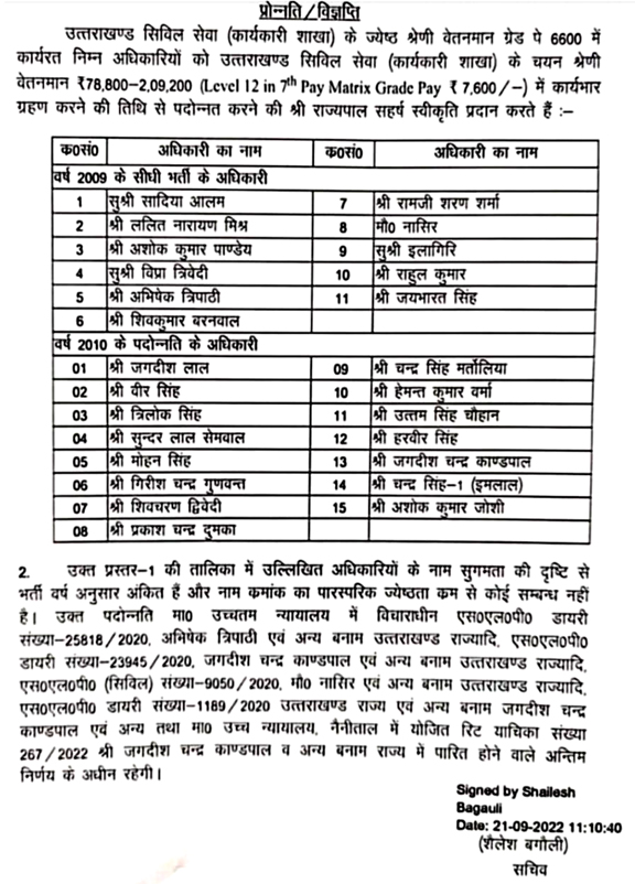 यह प्रमोशन उत्तराखंड सिविल सेवा कर्मचारी शाखा के श्रेणी वेतनमान ग्रेड पे 6600 में कार्यरत अधिकारियों को किया गया है।