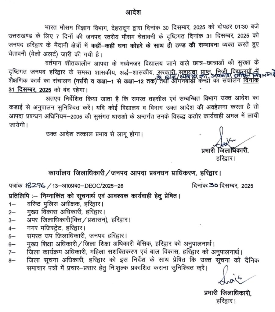 हरिद्वार। शीतलहर के दृष्टिगत जनपद हरिद्वार में नर्सरी से कक्षा 12 तक तक समस्त शासकीय, अशासकीय विद्यालय, आंगनबाड़ी केंद्र 31 दिसंबर को बंद रहेंगे। मौसम विभाग के मैदानी इलाकों में येलो अलर्ट के दृष्टिगत आदेश जारी किए गए हैं। प्रभारी जिलाधिकारी के मुताबिक आदेश का उल्लंघन करने पर प्रभावी कार्रवाई अमल में लाई जाएगी।