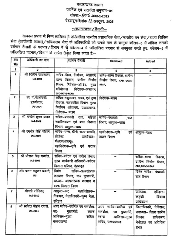 प्रदेश में 44 आईएएस व पीसीएस के तबादले, देंखें लिस्ट October 12, 2025October 12, 2025 gatimannews देहरादून। शासन ने प्रदेश में 44 आईएएस व पीसीएस के तबादले किए हैं। जिसमें एचआरडीए उपाध्यक्ष अंशुल सिंह को डीएम अल्मोडा के पद पर स्थानांतरित किया है। देंखें लिस्ट