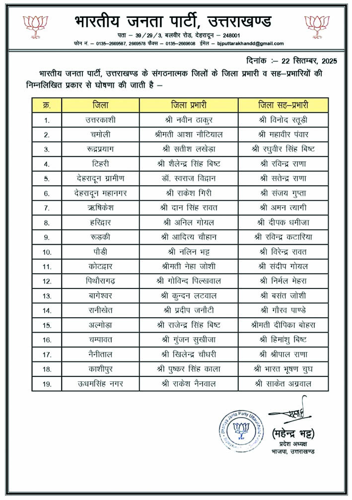 हरिद्वार। भारतीय जनता पार्टी के प्रदेश अध्यक्ष महेन्द्र भट्ट ने उत्तराखण्ड के सभी संगठनात्मक जिलों के जिला प्रभारी व सह जिला प्रभारियों की घोषणा कर दी है।
