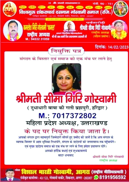 लोगों को कहना है कि जब सीमा गिरि से सीमा शर्मा हो चुकी हैं तो उन्हें गोस्वामी समाज का पदाधिकारी कैसे बनाया जा सकता है।