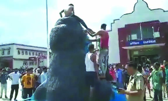 हरिद्वार। रविवार को एक कावडि़ए ने नशे में धुत होकर हरिद्वार रेलवे स्टेशन परिसर में स्थापित भगवान शिव की मूर्ति के सिर पर चढ़कर तांड़व किया, जिसे बड़ी मुश्किल से लोगों ने नीचे उतारा।