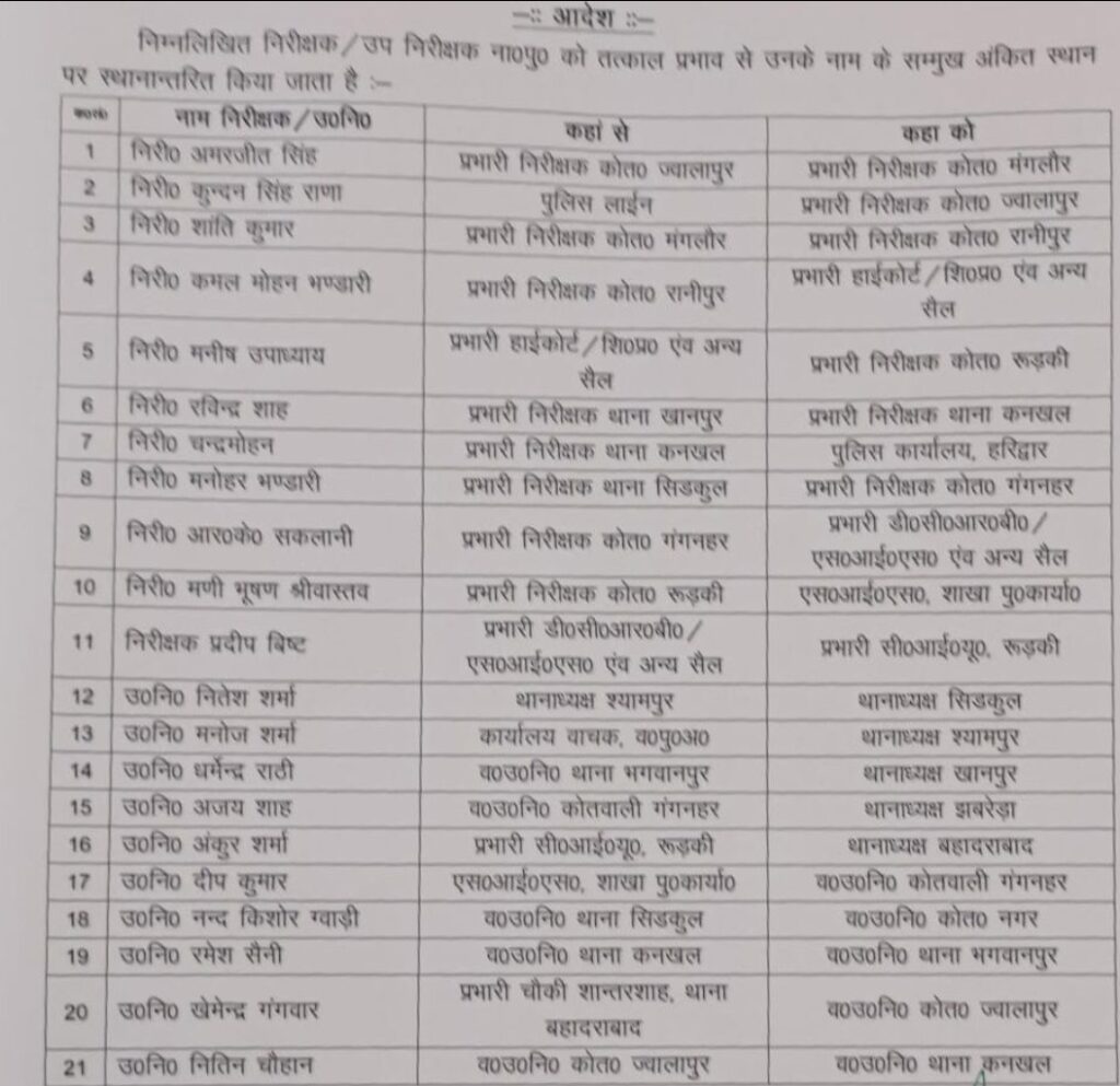 एसएसपी ने किए 21 निरीक्षक व उप निरीक्षकों के तबादले September 7, 2025September 7, 2025 gatimannews हरिद्वार। एसएसपी प्रमेन्द्र सिंह डोभाल ने शनिवार की रात जनपद के 10 इंस्पेक्टर्स व 11 सब इंस्पेक्टर्स के तबादले किए हैं, देखें लिस्ट।