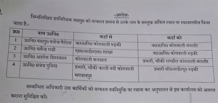 हरिद्वार। एसएसपी प्रमेन्द्र सिंह डोभाल ने एक बार फिर से पुलिस विभाग में फेरबदल करते हुए चार उप निरीक्षकों के तबादले किए हैं। एसएसपी ने उप निरीक्षक मनोज गैरोला को कोतवाली रूड़की से कोतवाली मंगलौर, उप निरीक्षक धर्मेन्द्र राठी को एसआईएस शाखा से कोतवाली रूड़की, उप निरीक्षक अशोक सिरस्वाल को कनखल से चौकी प्रभारी लण्ढौरा च उप निरीक्षक संजय पुनिया को चौकी काली नदी भगवानपुर से प्रभारी सीआईयू यड़की के पद पर स्थानांतरित किया है।