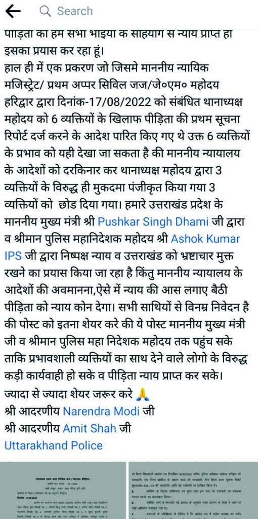 हरिद्वार। मंशा देवी स्थित दुकान संचालिका शशी ठाकुर द्वारा जबरन दुकान में घुसकर गाली-गलौच करने, अभद्रता करने तथा दुकान को जबरन खाली कराने के प्रयास के आरोप में कोर्ट द्वारा छह लोगों के विरूद्ध मुकद्मा दर्ज करने के आदेश को धत्ता बताते हुए नगर कोतवाली पुलिस ने तीन लोगों के खिलाफ मुकद्मा दर्ज कर लिया है। जबकि तीन अन्यों को मुकद्में से बाहर कर दिया गया है। पुलिस द्वारा कोर्ट के आदेश के बाद तीन लोगोें को बाहर किए जाने के बाद सामाजिक कार्यकर्ता वासू सिंह ने मुख्यमंत्री पुष्कर सिंह धामी, पुलिस महानिदेशक अशोक कुमार, प्रधानमत्री नरेन्द्र मोदी व केन्द्रीय गृह मंत्री अमित शाह को पत्र भेजकर प्रभावशाली व्यक्तियों को साथ देने वालों के खिलाफ कड़ी कार्यवाही करने की माग की है।
