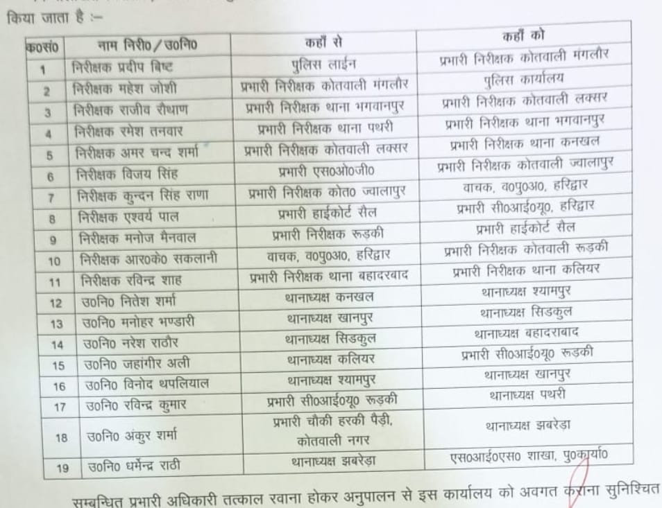 हरिद्वार। जनपद में SSP ने बड़े पैमाने पर निरीक्षक व उप निरीक्षकों के तबादले किए हैं।