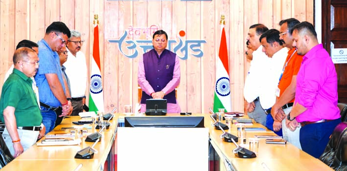 देहरादून। मुख्यमंत्री पुष्कर सिंह धामी ने शुक्रवार को मुख्यमंत्री आवास में उच्च अधिकारियों के साथ बैठक के दौरान गुजरात के अहमदाबाद में हुए विमान हादसे में जान गंवाने वालों को श्रद्धांजलि दी।