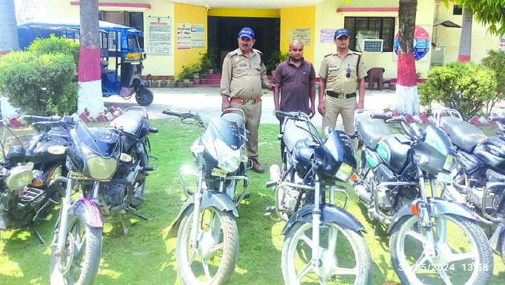 जानकारी के मुताबिक रानीपुर कोतवाली पुलिस ने चैकिंग के दौरान कोतवाली में दर्ज बाइक चोरी संबंधी मुकदमे में बेरियर नंबर 06 से आगे रेगुलेटर पुल के पास से चोरी की बाइक के साथ एक आरोपित को गिरफ्तार किया। सख्ती से पूछताछ करने पर आरोपित की निशानदेही पर पुलिस ने सात अन्य चोरी की बाईक बरामद की। पुलिस ने अलग-अलग थाना क्षेत्रों से चोरी की गई बाईकों को दादूपुर गांव से पहले आयशा कॉलोनी में बने खंडहरनुमा फ्लैट में बरामद कीं।