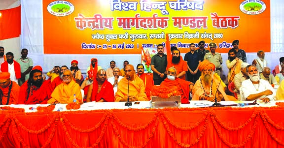 उपवेशन के प्रथम सत्र में भारतीय संस्कृति और संस्कारों पर कुठराघात, समलैंगिकता और लिव इन रिलेशनशिप विषय पर संतांे ने अपने विचार प्रकट कर गहन चिंतन किया। उपस्थित समस्त धर्माचार्यों ने कहा कि देश में भारतीय संस्कृति और संस्कारों को विदेशी षडयंत्रों पर आधारित नैरेटिव अर्थात विमर्श के माध्यम से समाज और देश को तोड़ने का षडयंत्र चल रहा है, इसे भलीभांति समझ कर इसका विरोध करने की आवश्यकता है। संतांे ने देश में निर्बाध चल रहे अवैध धर्मान्तरण के विरोध में कठोर कानून बनाने की मांग की। उपवेशन में उपस्थित समस्त संतजनों ने आक्रोश व्यक्त करते हुए कहा कि सरकार के द्वारा मंदिरों का अधिग्रहण नहीं होना चाहिए, अधिग्रहित मंदिरों का सरकारी नियंत्रण समाप्त होना चाहिए। इसके लिये जनजागरण का अभियान चलाने का संकल्प भी लिया गया। जूनापीठाधीश्वर आचार्य महामंडलेश्वर स्वामी अवधेशानंद गिरी महाराज ने समाज के प्रबोधन विषय पर विचार प्रकट किए। विश्व हिन्दू परिषद के केन्द्रीय मार्गदर्शक मण्डल बैठक (उपवेशन) में देश भर से 350 शीर्ष संतों एवं 70 साध्वी धर्माचार्यो ने प्रतिभाग किया।